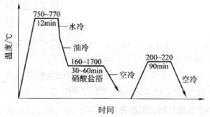 三、優(yōu)化淬火溫度提高工模具壽命 淬火溫度是鋼件淬火過(guò)程的重要工藝參數(shù),常用鋼的淬火溫度在熱處理手冊(cè)和有關(guān)技術(shù)書中都有數(shù)據(jù)可查,在生產(chǎn)中一般皆以此為選擇淬火溫度的依據(jù),這是無(wú)可非議的。但是,隨著近兒年來(lái)對(duì)馬氏體形貌和強(qiáng)韌化原理的深人研究,以及大量的工藝試驗(yàn)和實(shí)踐,為我們?nèi)绾胃侠淼剡x擇淬火溫度,提供了新的依據(jù)和經(jīng)驗(yàn)。由于在制定工藝或?qū)嶋H操作中,能正確選振和嚴(yán)格控制淬火溫度,往往可以使多種工模具的使用壽命顯著提高,取得明顯的經(jīng)濟(jì)效益。
