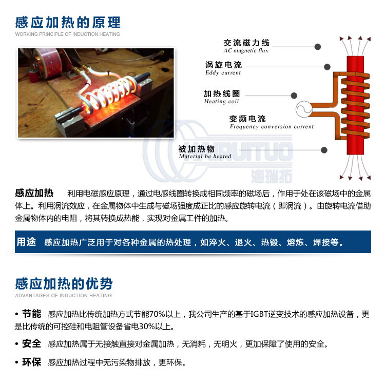 高頻大電流流向被繞制成環狀或其它形狀的加熱線圈(通常是用紫銅管制作),由此在線圈內產生極性瞬間變化的強磁束,將金屬等被加熱物質放置在線圈內,磁束就會貫通整個被加熱物質,在被加熱物質內部與加熱電流相反的方向產生很大的渦電流,由于被加熱物質內的電阻產生焦耳熱,使物質自身的溫度迅速上升從而達到加熱的效果。